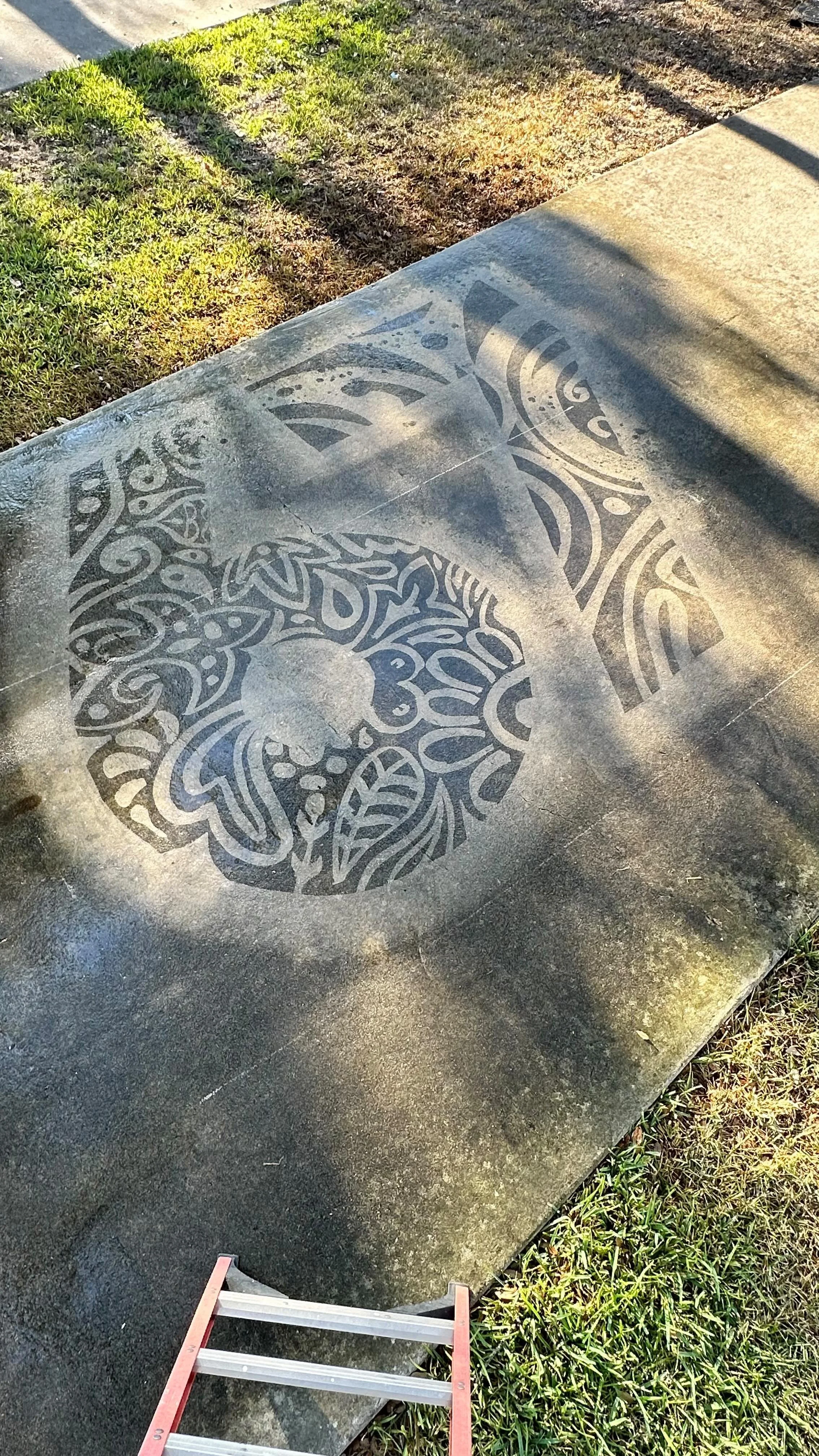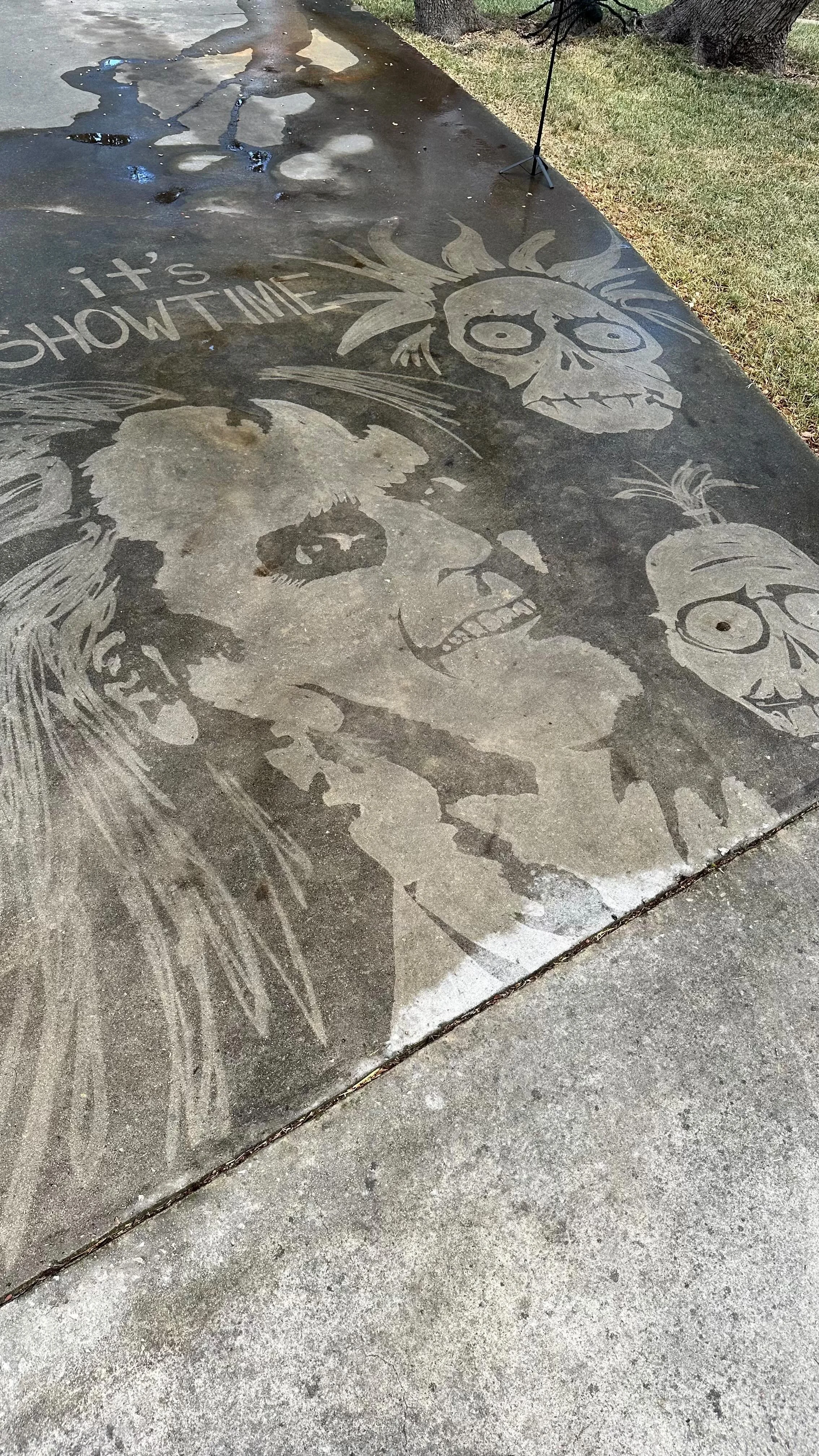 At the beginning of the COVD-19 pandemic, I bought a 180-pack of sidewalk chalk in the hope my family and I would color our entire driveway. Before we could do that, I needed to get out the pressure washer I had probably only ever used once in the 5 years I owned it to clean the concrete. I got bored with the monotony of cleaning and began making shapes that looked kind of like flames. It was at that point “Power Washing Art” was born, and I haven’t cleaned a whole surface since. It has been amazing how much people have enjoyed it and the art form has opened some amazing opportunities for me.